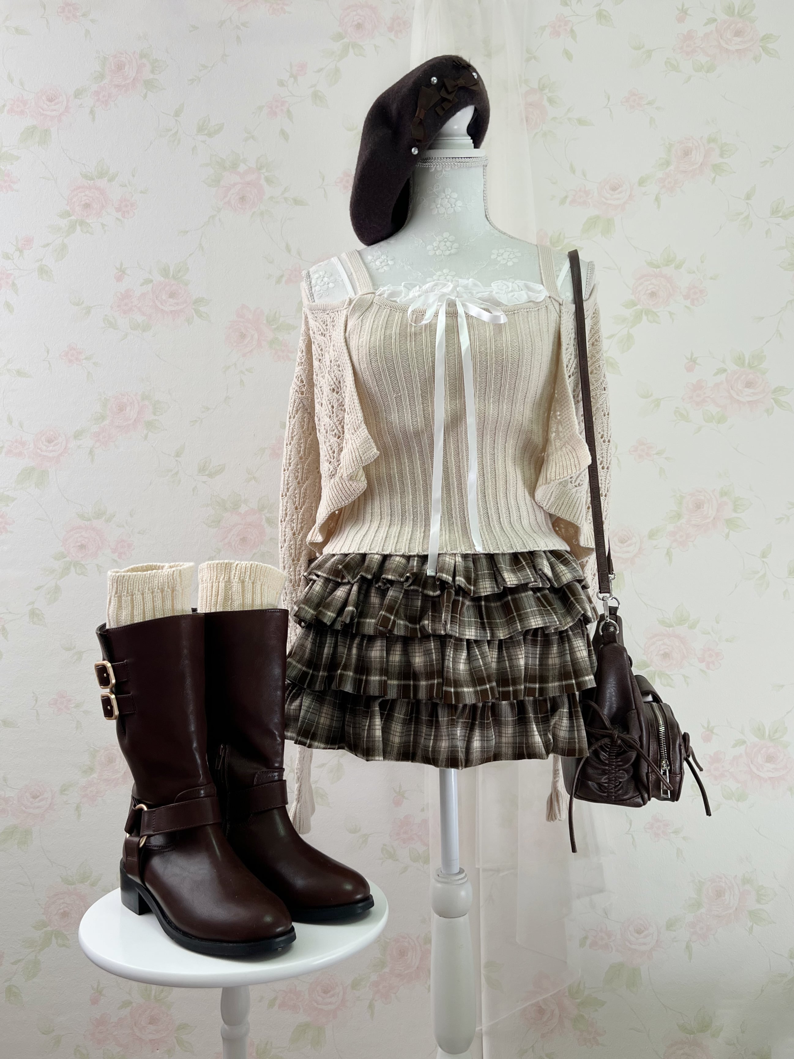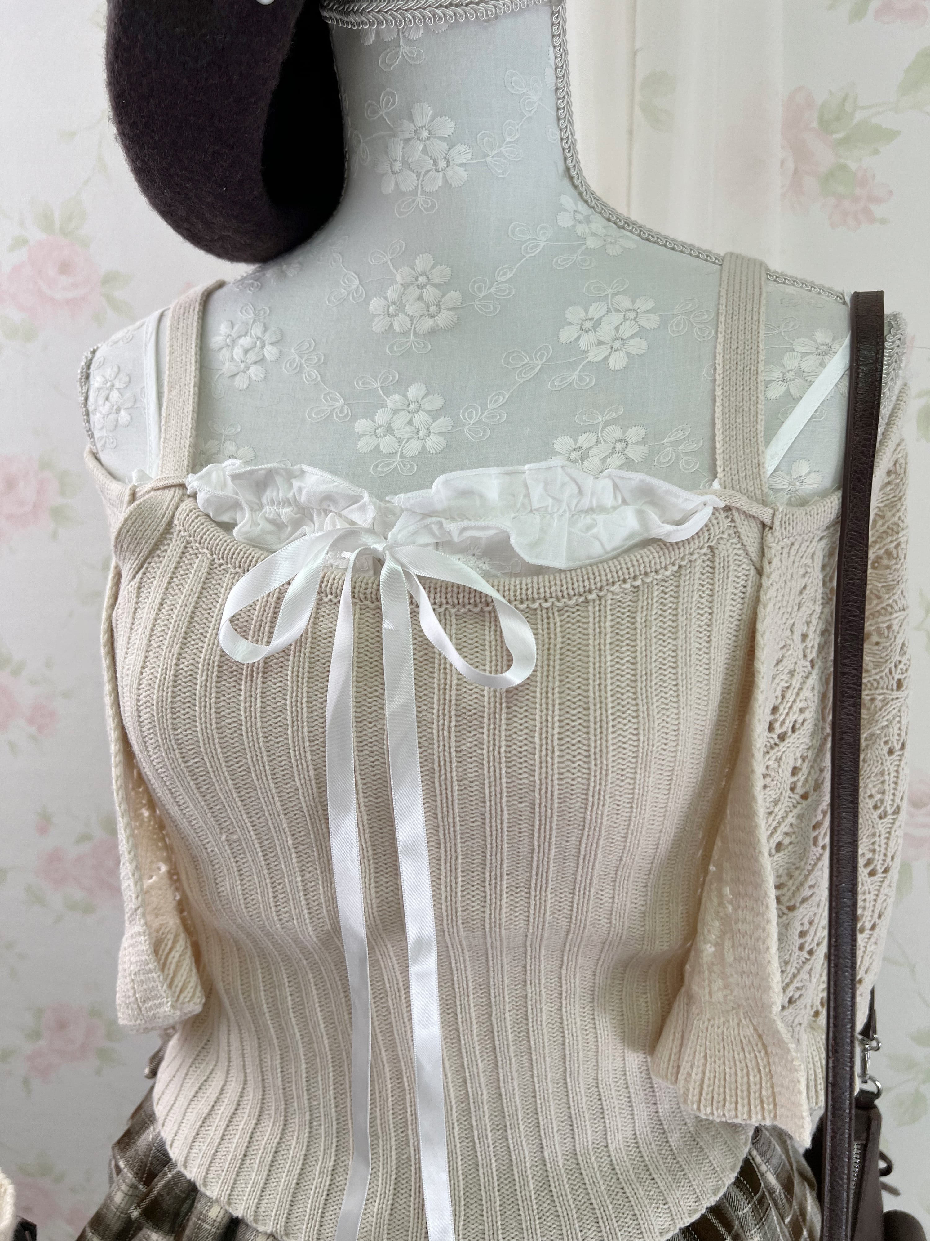 Ruffled Hem Knitted Camisole Cardigan Set (Beige)
