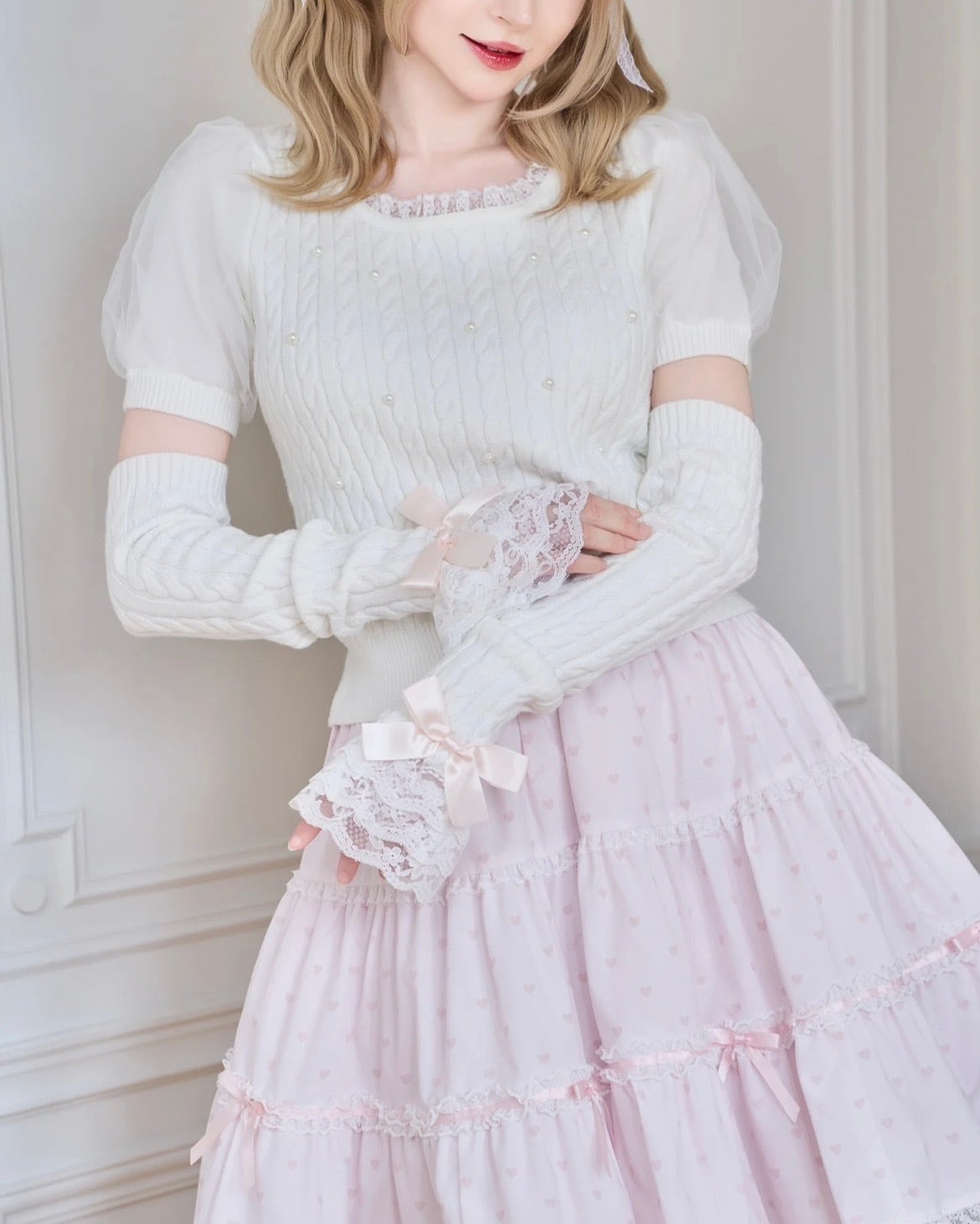 mellfy memory Pearl cable knit Lace arm warmer Knit Top