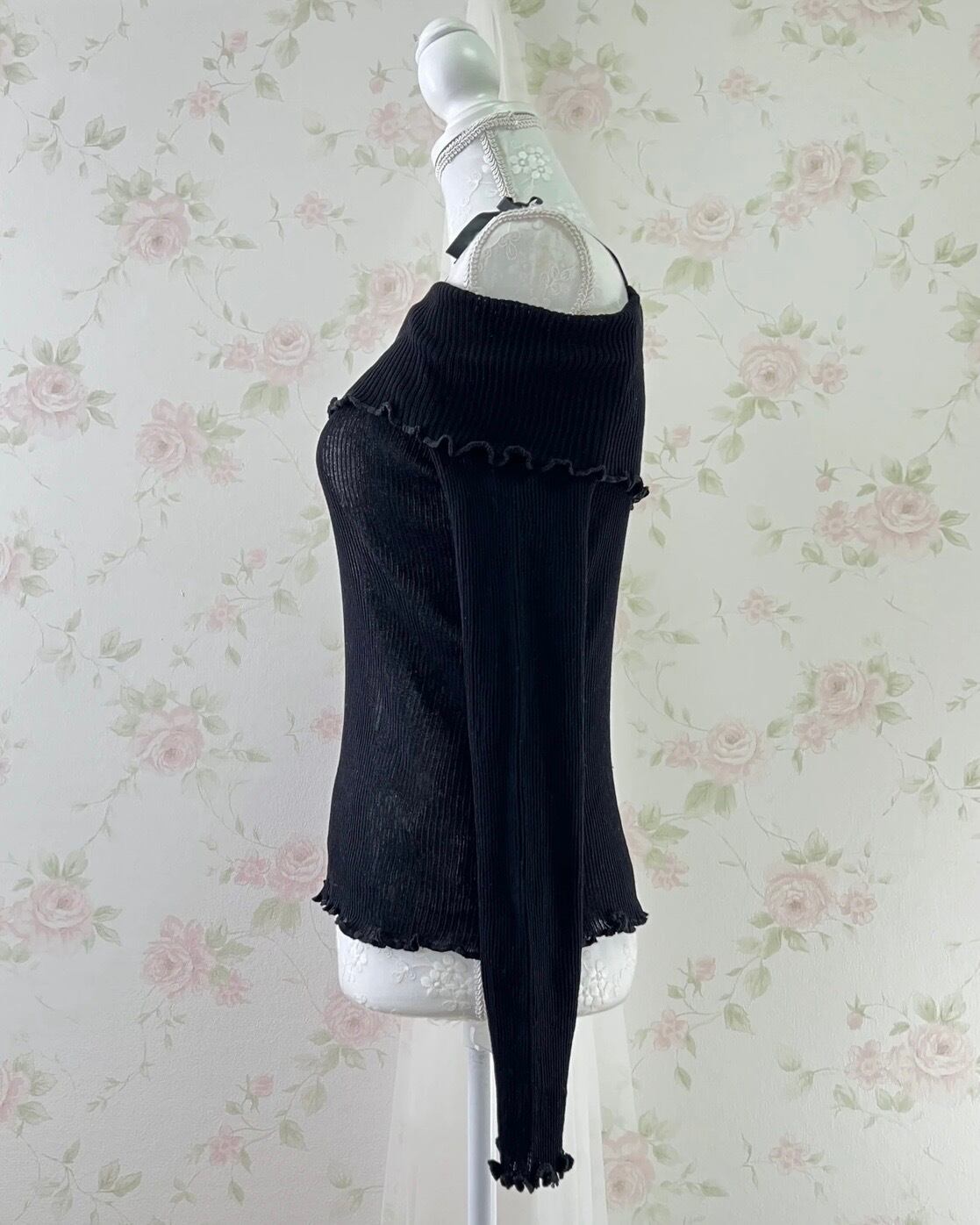 Off Shoulder String Knit Top (black)