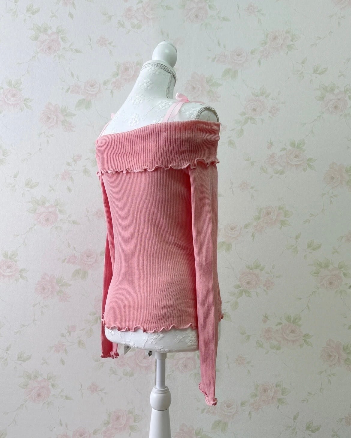 Off Shoulder String Knit Top (Peach Pink)