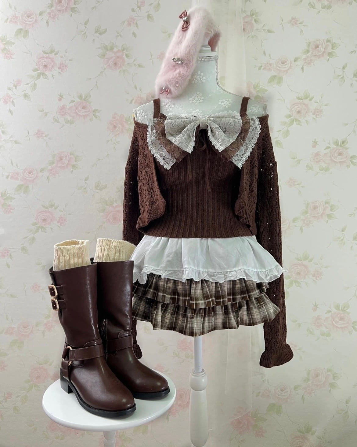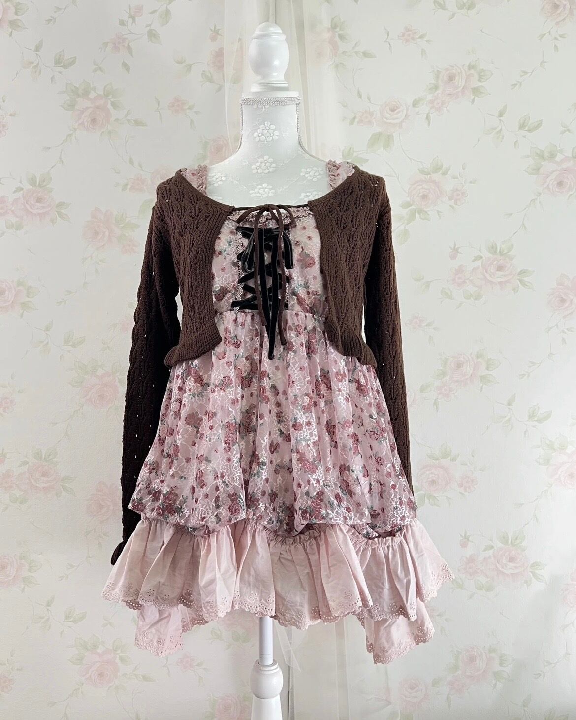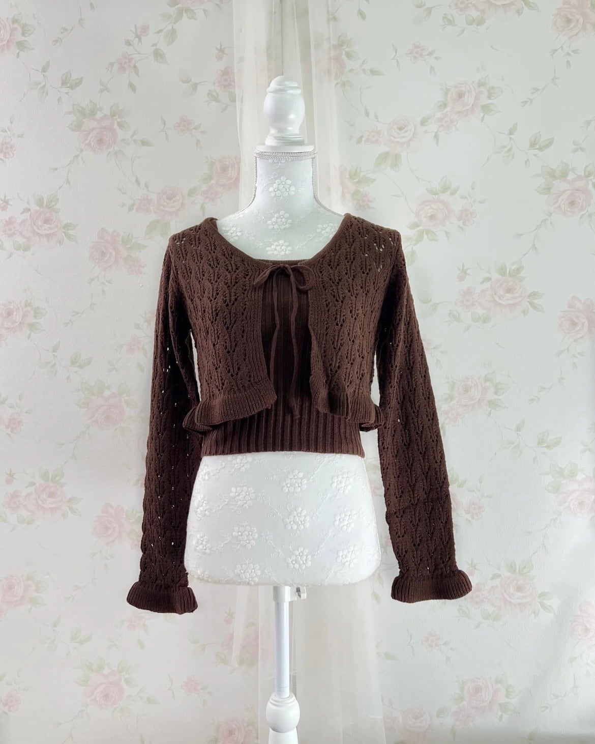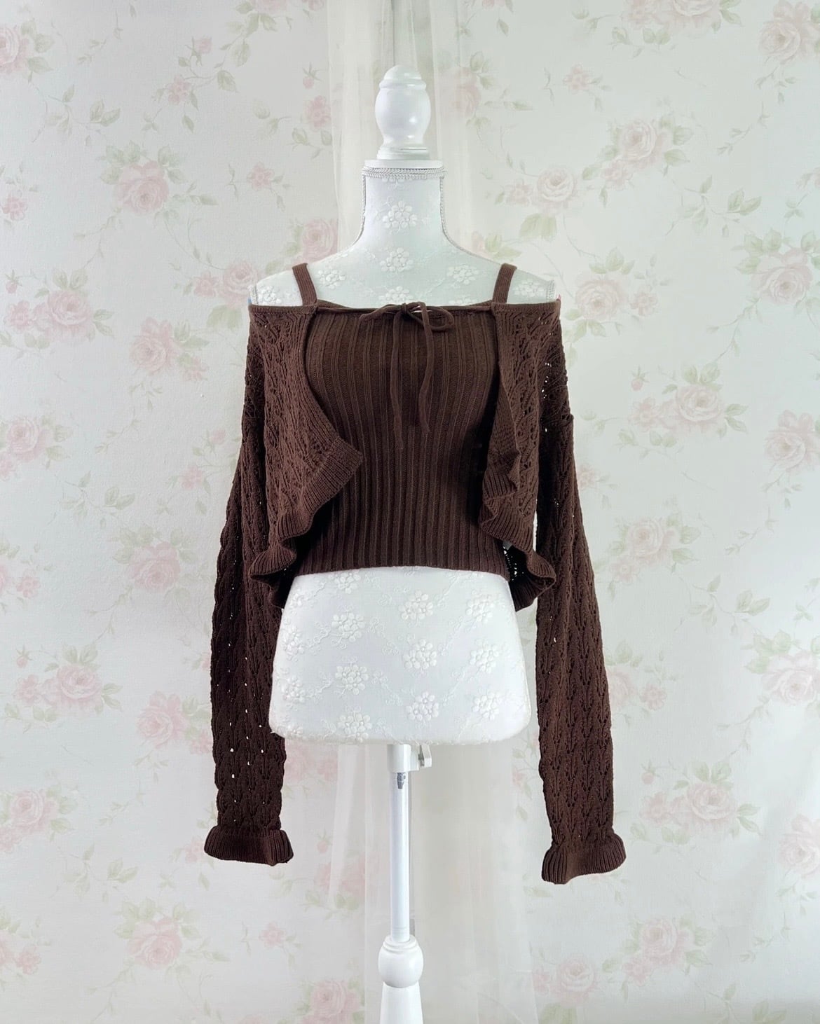 Ruffled Hem Knitted Camisole Cardigan Set (Chocolate)